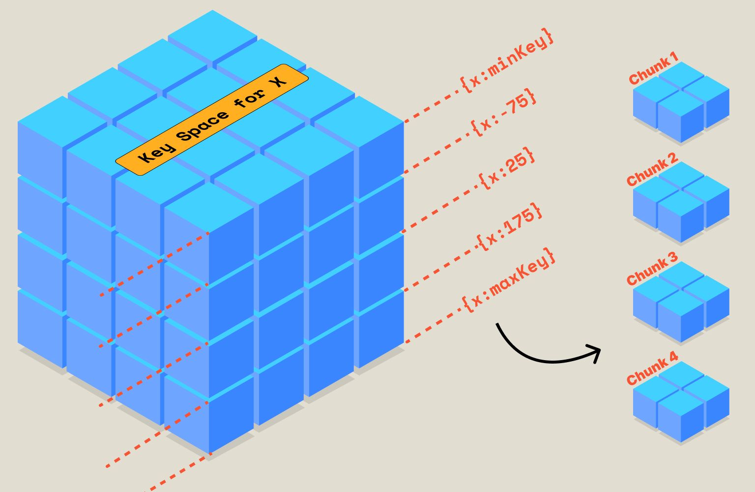 In this technique, chunking is based on the range of values suitable for the available or planned number of shards. Here’s a visual representation: based on the value of x, we divide the data into four chunks. This technique is simple and repeatable. However, if you query overlapping ranges of x, it requires a query and joins across multiple shards, ruling out the possibility of leveraging data-locality-based processing closer to the chunk.