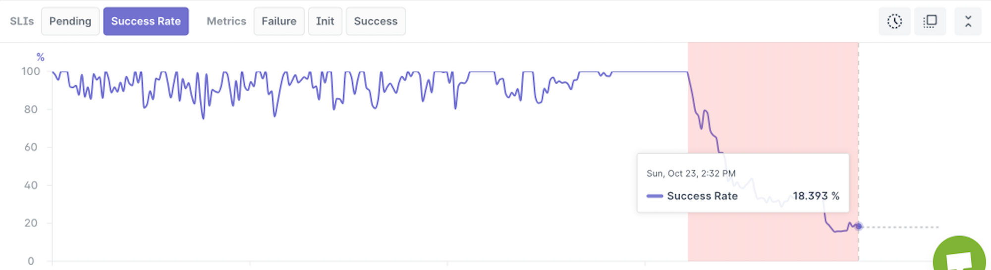 Last9’s ChangeBoard was able to detect that customers were facing a sudden drop in payments subscription with one particular fintech provider. In fact, there’s a dramatic dip.