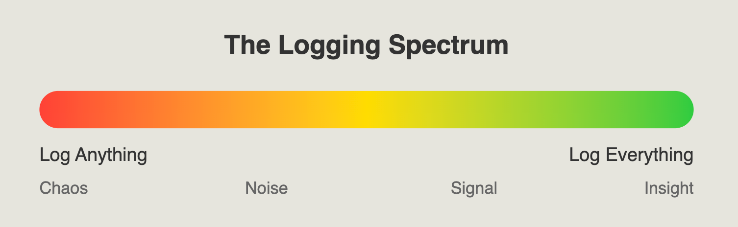 At one end, we have the "Log Anything" approach, and at the other, the "Log Everything" strategy. Let's break these down and see why moving towards the right end of the spectrum can save you (and your future self) from countless headaches and the best way to reach there.