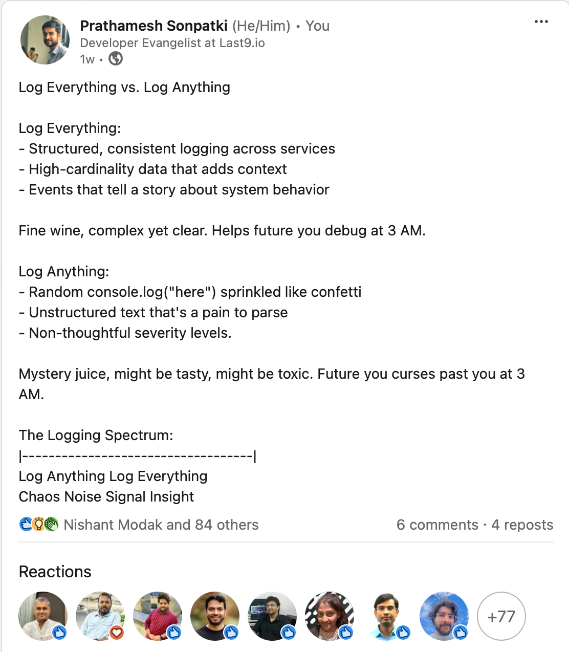 Recently, I posted on LinkedIn about what I've observed in terms of logging practices across different teams. The post resonated with many developers, sparking discussions and suggestions. So, I thought it would be worthwhile to expand on this topic and share my opinions in more detail.