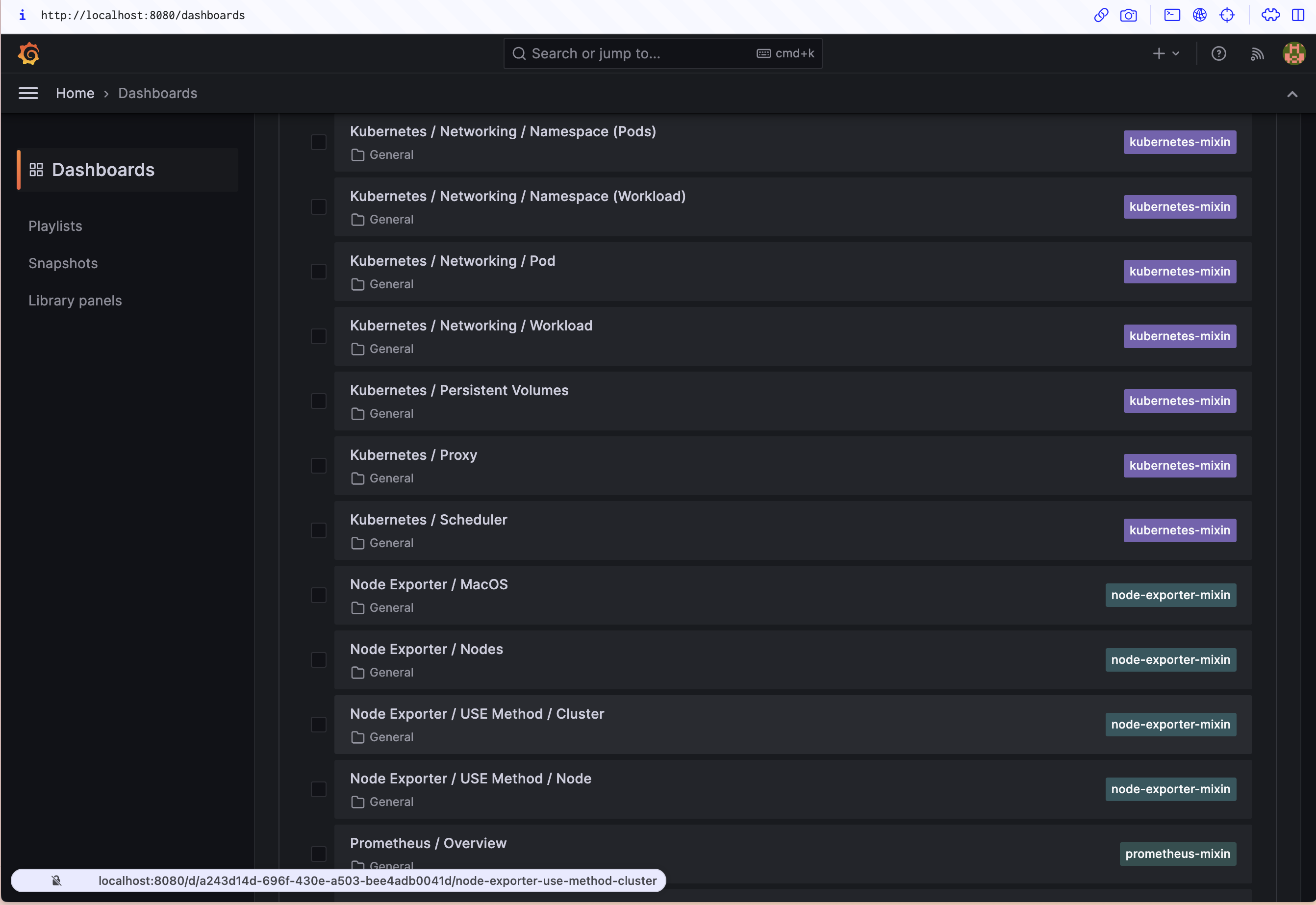 The kube-prometheus-stack project provides several prebuilt dashboards. You can find them by clicking the Dashboards icon in the left sidebar and then expanding the General folder. The dashboards cover your Kubernetes nodes, objects, API server, DNS, and Prometheus and Grafana instances.