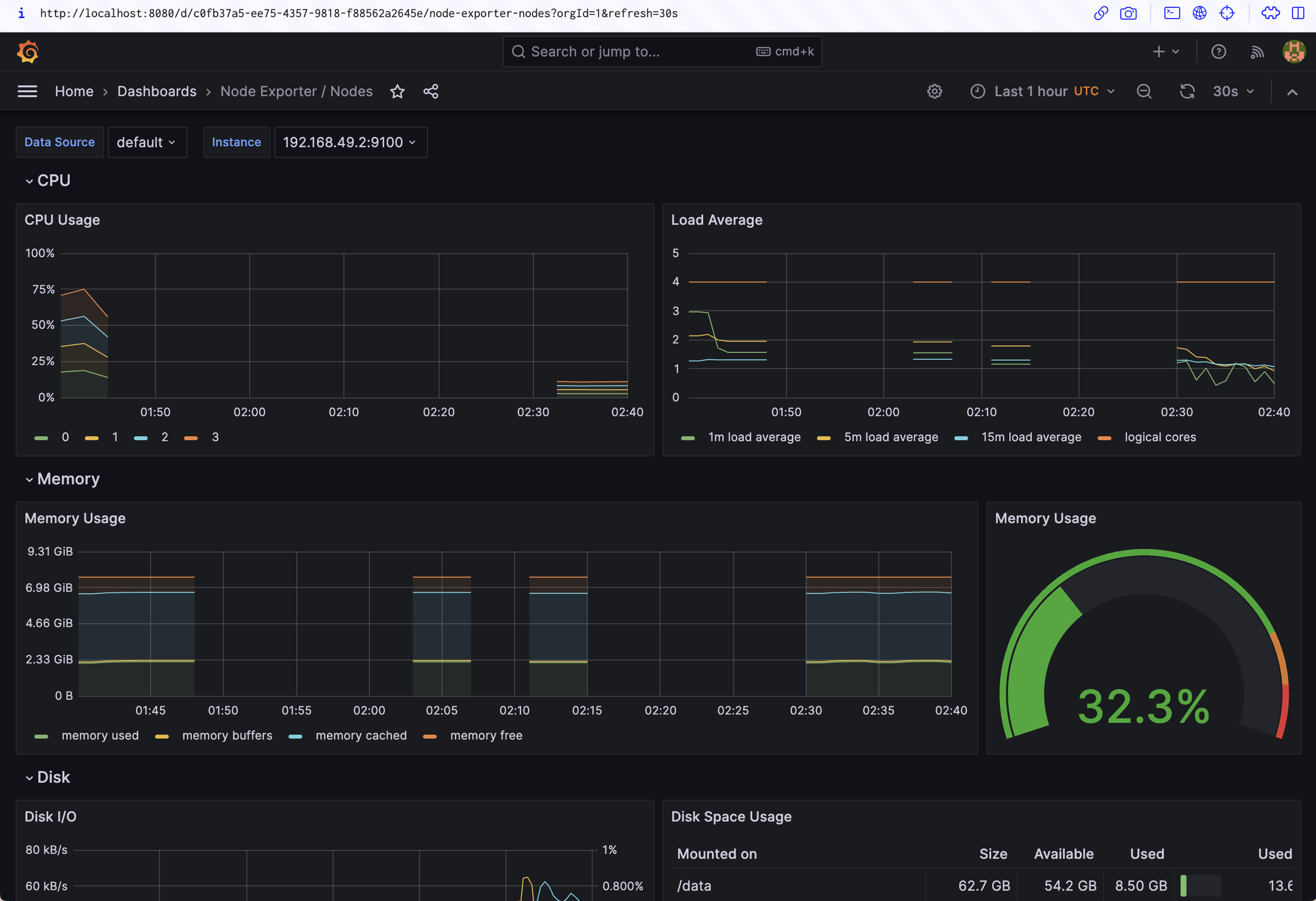 Here's the Node Exporter / Nodes dashboard, which shows the resource utilization of each of the nodes in your cluster: