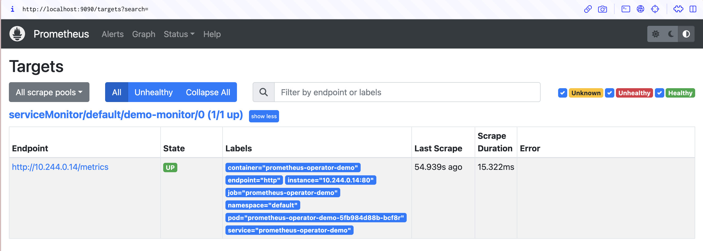 Return to the Prometheus UI in your browser (http://localhost:9090) and head to the Status > Targets page using the menu at the top of the screen. You can also visit http://localhost:9090/targets directly. The page should include an entry for your prometheus-operator-demo-monitor service monitor that shows the last scrape time and its duration:
