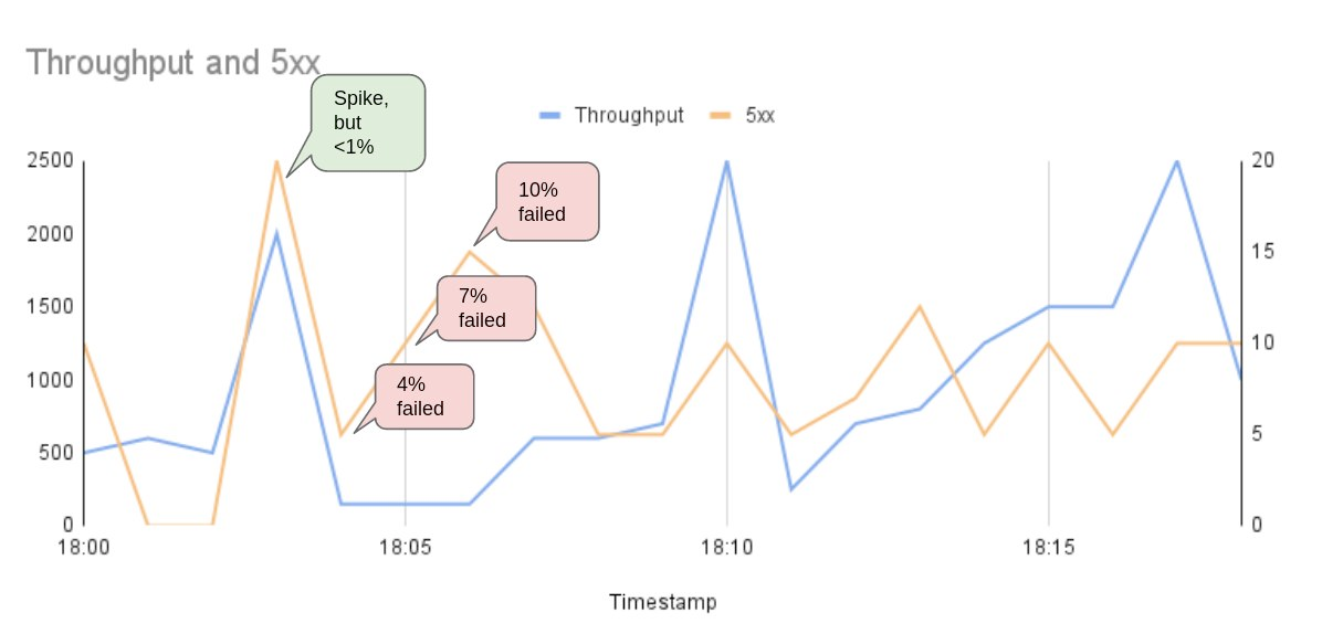 | Number of minutes where error_rate (5xx/throughput) > 1% | 53% |