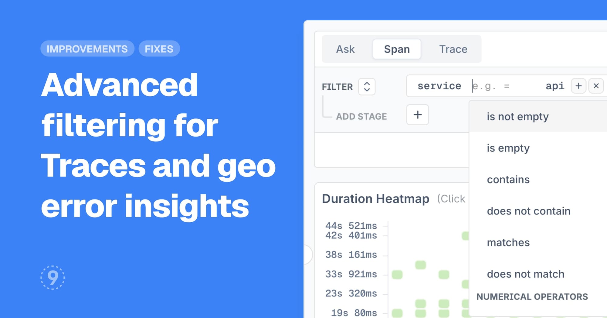 - Trace Explorer: Advanced filter support with AND/OR/NOT logic is now available in the Traces query builder, bringing the same powerful filtering capabilities you use in Logs to your trace analysis