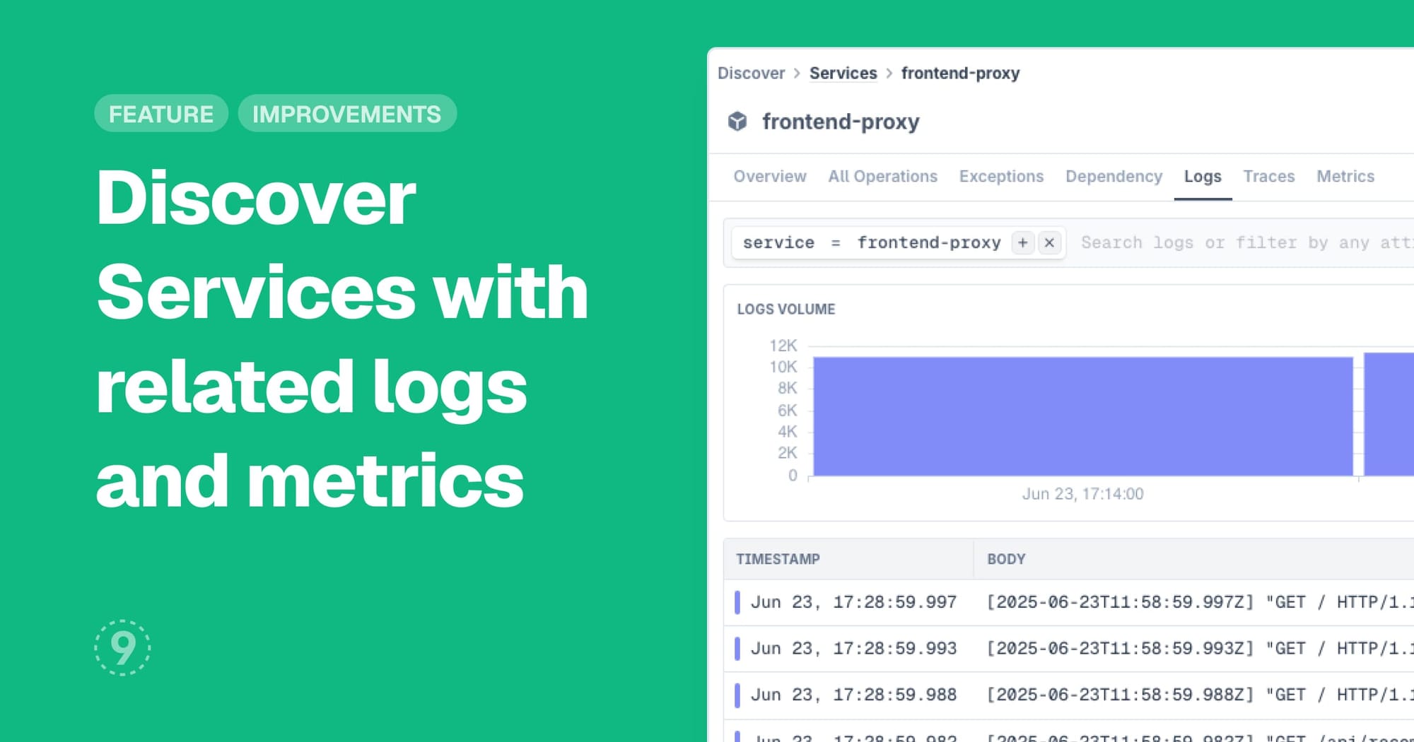 Discover Services gets more powerful with direct access to service-specific logs and infrastructure metrics. Your service detail pages now integrate filtered log data and essential container performance metrics, creating a complete picture of service health and behavior.