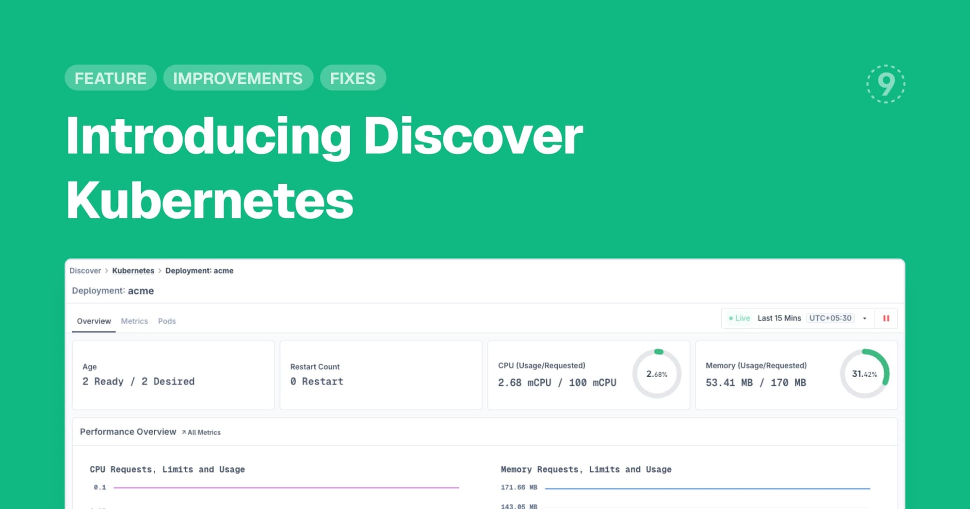 Our new Kubernetes discovery dashboard brings full visibility into your containerized infrastructure. Navigate through your clusters, deployments, and pods with detailed performance metrics and resource utilization tracking.