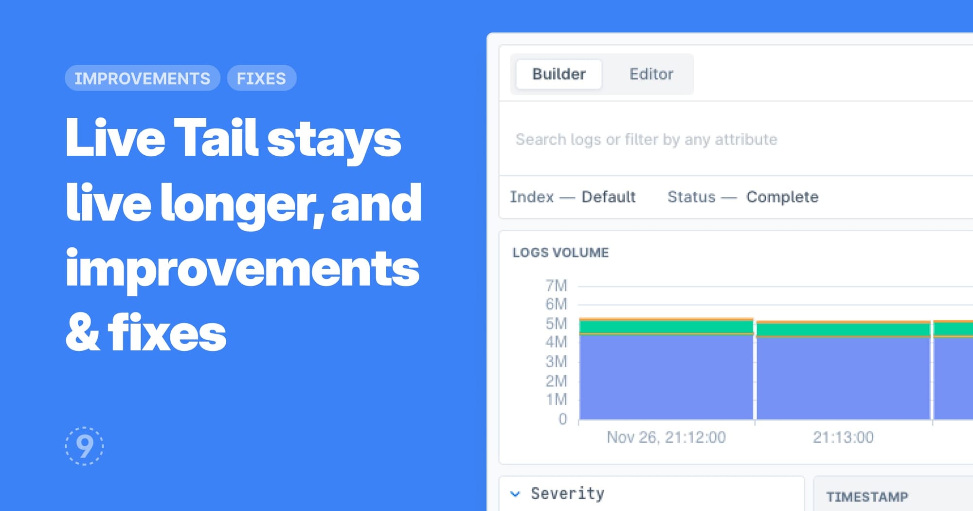 - Logs Explorer volume chart looks nicer even for small time periods, instead of sparse bars distributed across the width of the chart.