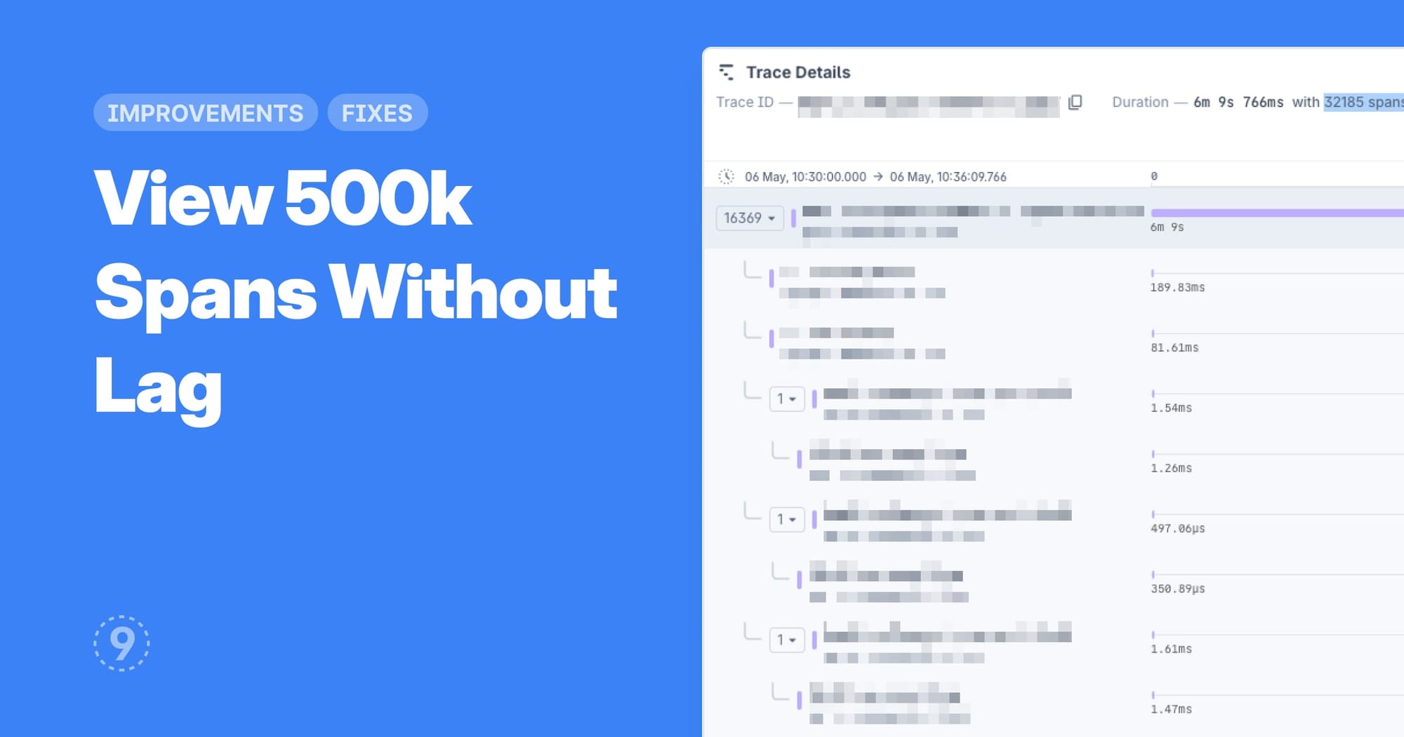 - Trace Explorer: Trace details now load and render up to 50,000 spans (Update: We stress tested it to 500k spans now!) without performance degradation or browser crashes