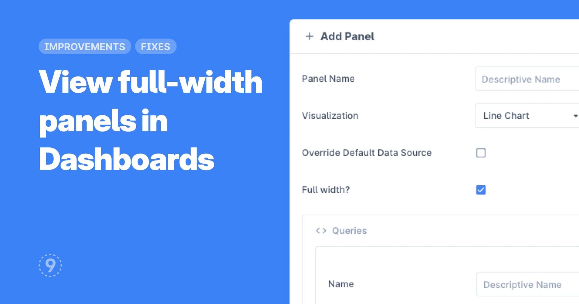- While adding or updating a panel in Dashboards, select full-width to let the panel take the entire horizontal space of the dashboard.
