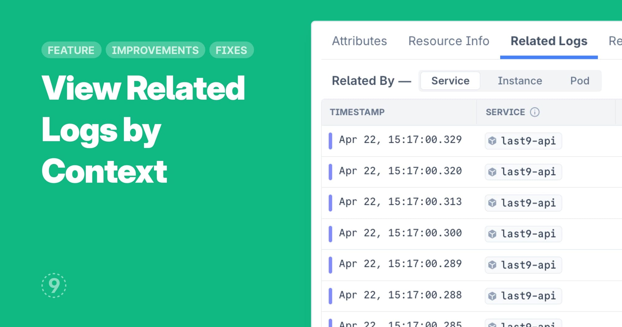 Now, while viewing the Log Details side panel, you can view related logs by service, instance, pod, or trace ID — giving you instant context without leaving your current workflow. This feature creates a seamless debugging experience by connecting the dots between different parts of your system automatically.