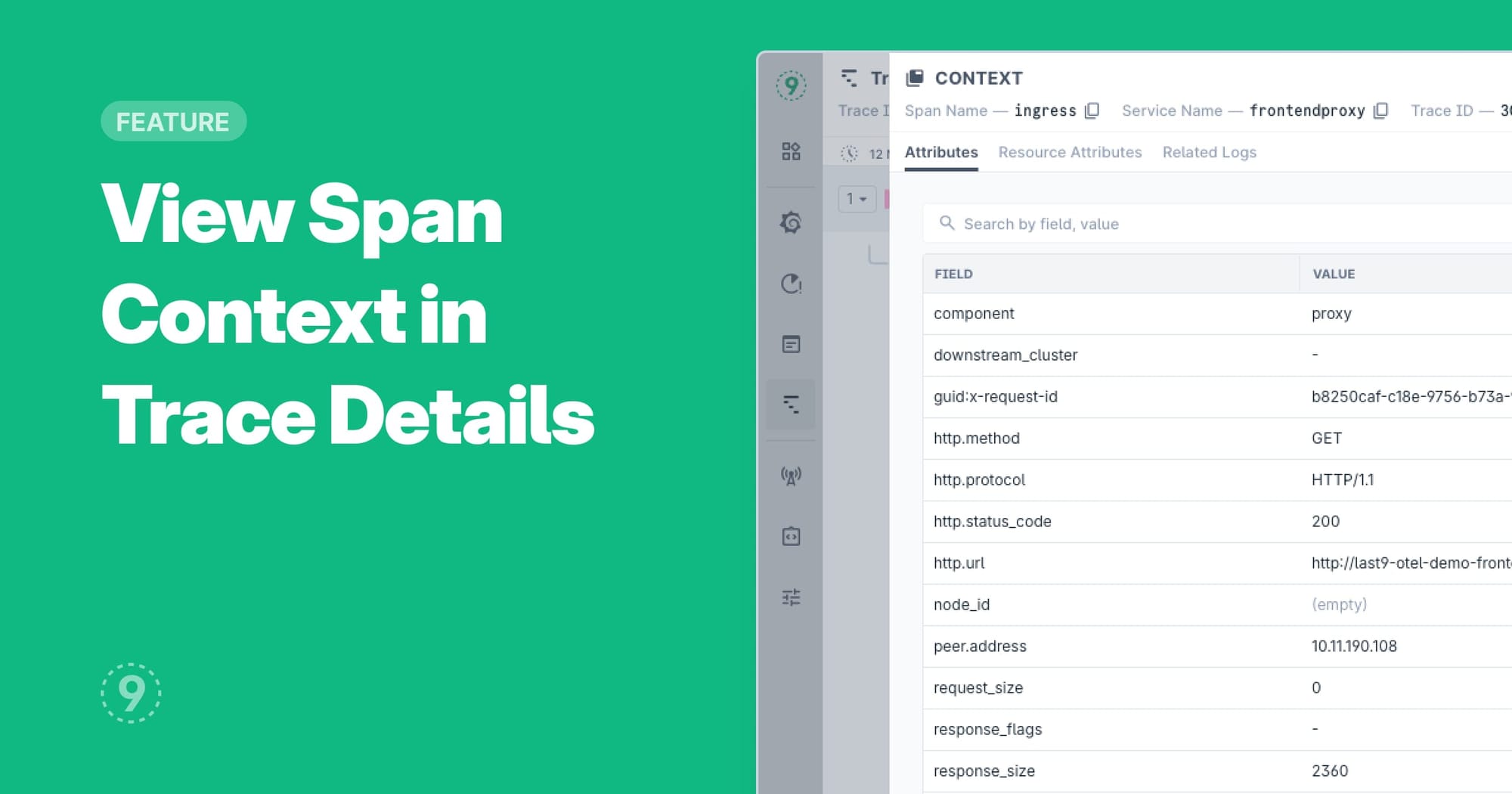 While viewing the Trace Details, you can now select any of the spans in the timeline view and click on Span Context at the bottom right to further dive into the selected span's attributes, resource info, and related logs.